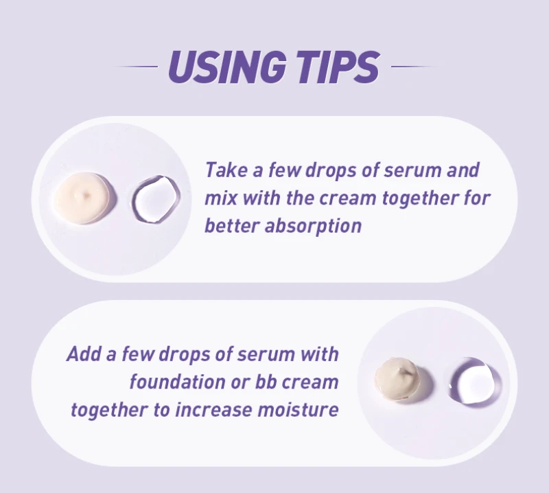 Возьмите несколько капель сыворотки и Смешайте с кремом вместе для лучшего поглощения.
