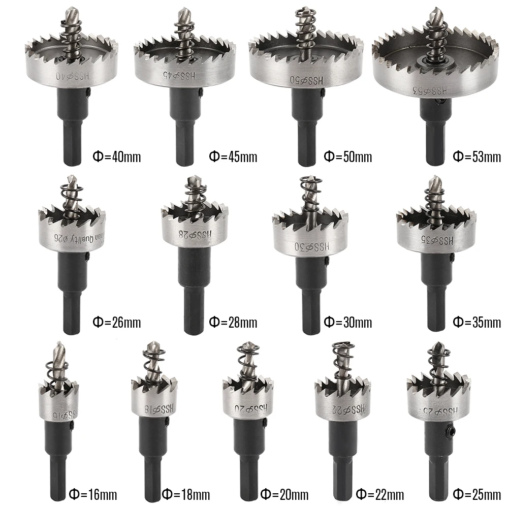 Размеры:16 мм, 18 мм, 20 мм, 22 мм, 25 мм, 26 мм, 28 мм, 30 мм, 35 мм, 40 мм, 45 мм, 50 мм, 53 мм (13 шт. наборы кольцевой пилы)