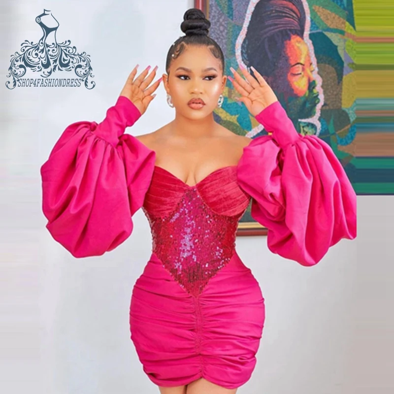 Атласное мини-платье с длинными рукавами-фонариками и блестками