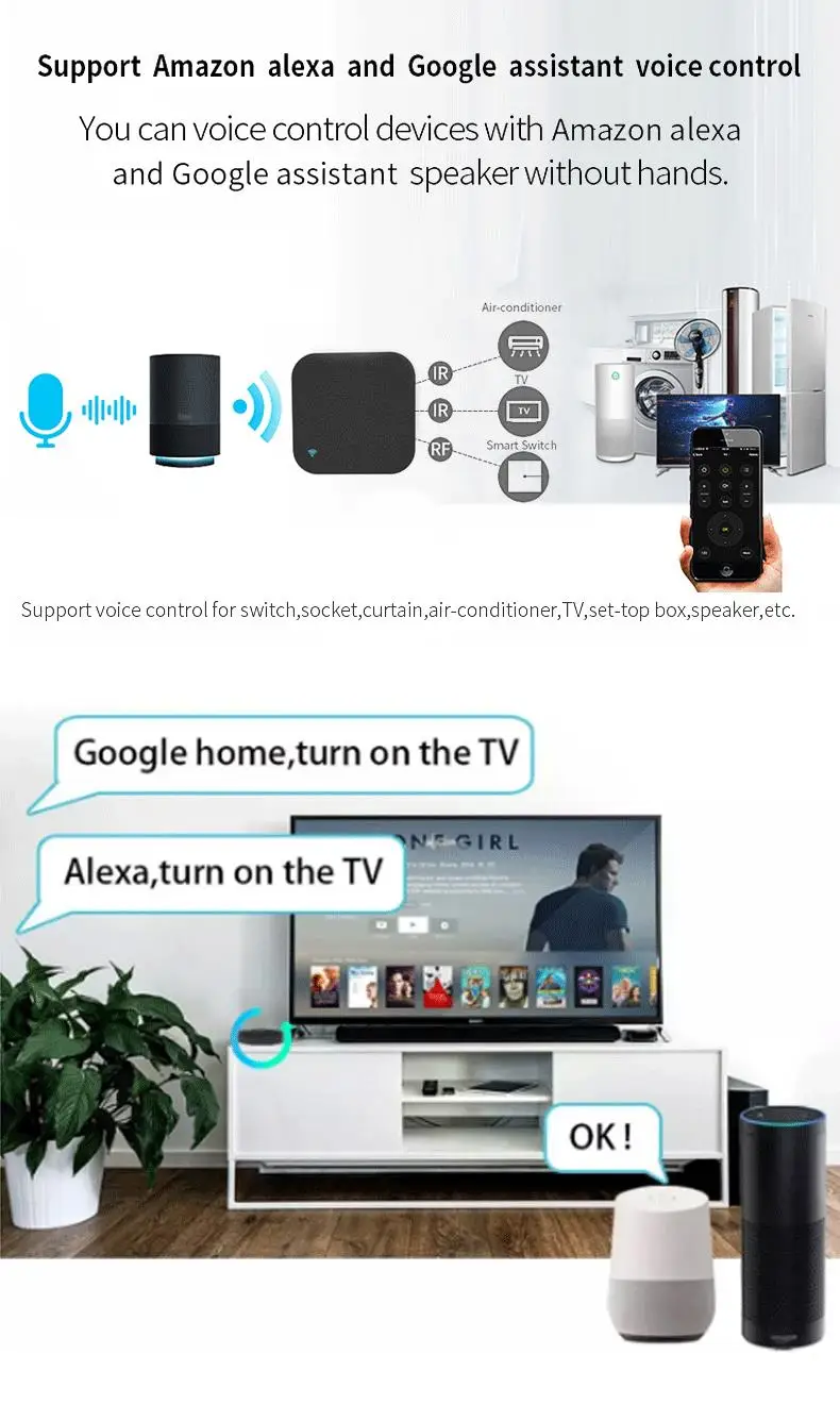 С помощью этого универсального ИК-пульта дистанционного управления вы можете использовать ваш смартфон для управления бытовой техникой, такой как STB (телеприставка), ТВ-приставка, телевизор, кондиционер, вентилятор, DVD и т. Д. Совместимость с большинством брендов, для получения подробной информации, пожалуйста, обратитесь к списку поддерживаемых брендов в приложении. Кроме того, он имеет функцию обучения, позволяет Копировать Ключевые функции оригинального пульта дистанционного управления в приложение.Примечание: Не совместим с бытовыми приборами, которые используют пульт дистанционного управления RF или BLUETOOTH.1. Массивная база данных ИК-кодовПоддержка брендов 4000 +, ИК-код 50000 + в облаке, поддержка библиотеки устройств ed постоянно обновляется облаком.2. Встроенный датчик температуры и влажностиС помощью встроенного датчика вы можете узнать температуру и влажность в помещении в любое время. И в соответствии с их ценностями, сделайте последующую автоматизацию. Например, включите кондиционер, когда температура выше 26 ℃, и включите увлажнитель воздуха при влажности менее 50%3. Дистанционное управление с помощью приложенияДистанционное управление бытовой техникой с помощью приложения «Tuya Smart» в вашем смартфоне в любом месте в любое время. Например: Включите home A/C заранее, наслаждаясь комфортной температурой, как только вы вернетесь домой.4. Легко установить и добавить в приложениеПосле того, как вы подключите кабельную линию к устройству, устройство начинает запускаться, а затем выберите функцию автоматического сканирования приложения, чтобы найти устройство. Весь процесс занимает всего несколько минут.5. Голосовое управлениеПри подключении интеллектуальных динамиков, таких как Amazon Alexa, Google Home, вы можете управлять своей бытовой техникой голосом. Например: Alexa, Включите телевизор; Ок Google, установите температуру кондиционирования воздуха до 25 градусов.6. Сценарий и автоматизация в приложенииСценарий состоит из 1 или более действий. Создав «Сценарий», вы можете управлять несколькими устройствами одним нажатием; Добавляя «автоматизацию» и взаимодействуя с другими устройствами smart home, пульт дистанционного управления Wi-Fi может выполнять действия автоматически в соответствии с такими условиями, как состояние устройства, погода и время.7. Таймер и Автоматический триггерСогласно вашим привычкам жизни, установите переключатели времени для вашей бытовой техники, такие как включение/выключение кондиционера через регулярные промежутки времени.8. Сделай СамНастройка кнопок в умном приложении Tuya, если ваш бренд бытовой техники не входит в список или не поддерживается.9. Вечерние контрольРаботает с Amazon Alexa, Google Assistant, Siri(iOS 12,0 или более поздней версии), Tmall Genie, Tecent Xiaowei, DingDong, Rokid, DuerOS и т. д.