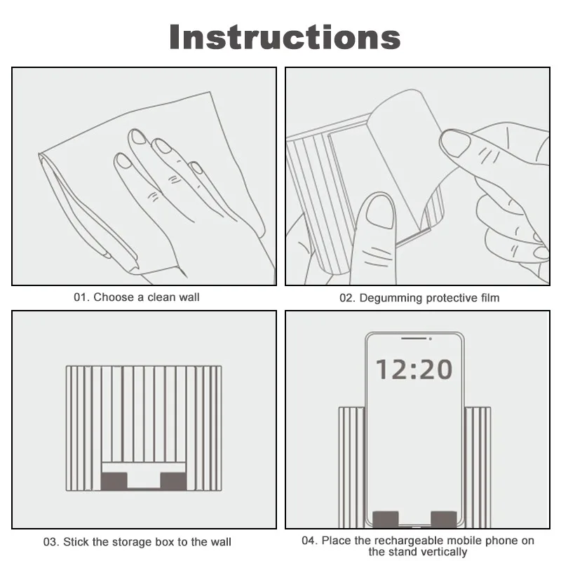 Инструкции:1. Выберите чистую стену2. Оторвите клейкую защитную пленку3. Приклейте ящик для хранения к стене4. Поместите зарядный мобильный телефон вертикально на кронштейн, и зарядный кабель проходит через зазубрину кронштейна