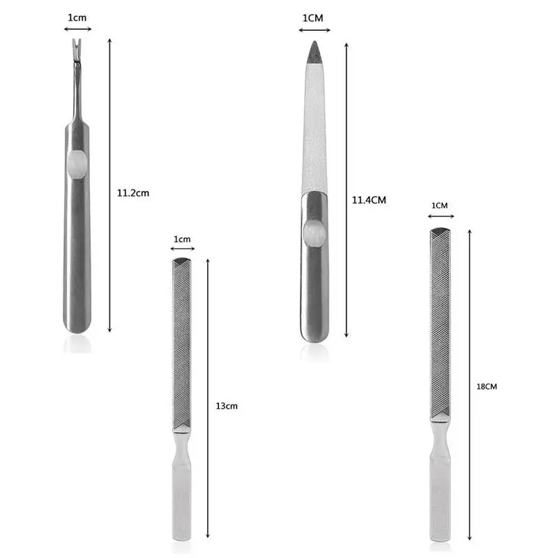 Спецификация: Размер: Пилка для ногтей: 11,4*1 см Омертвевшие чешуйки кожи и вилка: 11,2*1 см Короткая шлифовальная машина для ногтей: 13*1 см Длинная шлифовальная машина для ногтей: 18*1 см Материал: нержавеющая сталь Цвет: серебристый