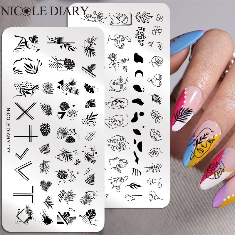 Трафареты NICOLE DIARY для стемпинга ногтей с абстрактной линией, пластины из нержавеющей стали для рисования ногтей молодых девушек, трафареты для дизайна ногтей с цветами, листьями