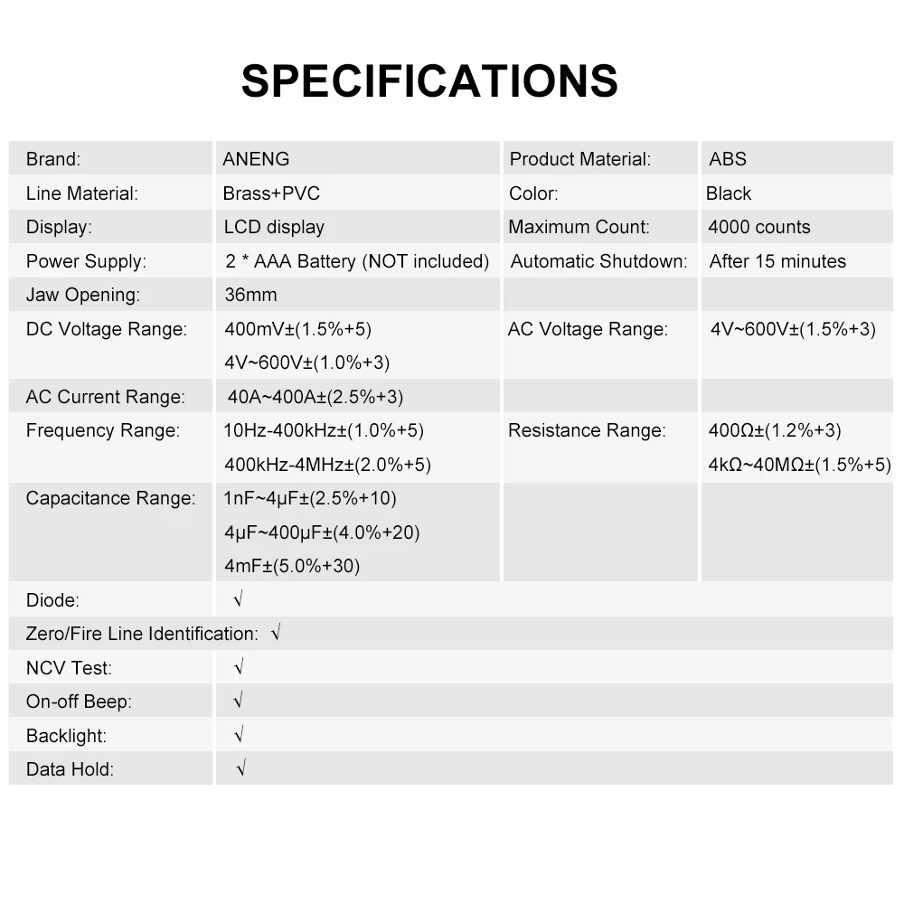 Характеристики:Бренд: ANENGМатериал: АБС-пластикЦвет: черный/красный/желтый (опционально)Максимальное количество: 6000 штукОткрытие зажимных тисков: 3,54 см/1.39inДлина кабеля: 98 смТип батареи: 1,5 V, батарея ААА, 2 шт. (не прилагаются)Товар Размеры: 18,48*6,5*3,32 см/7,27*2,55 * 1.3inВес изделия: 123,5 г/4,35 унцийПосылка Размеры: 23*9,2*3,8 см/9,05*3,62 * 1.49inВес посылка: 245 г/8,64 унцийУпаковочный лист:1 * измеритель зажима2 * Тестовый свинец1 * провод термопары1 * Руководство пользователя