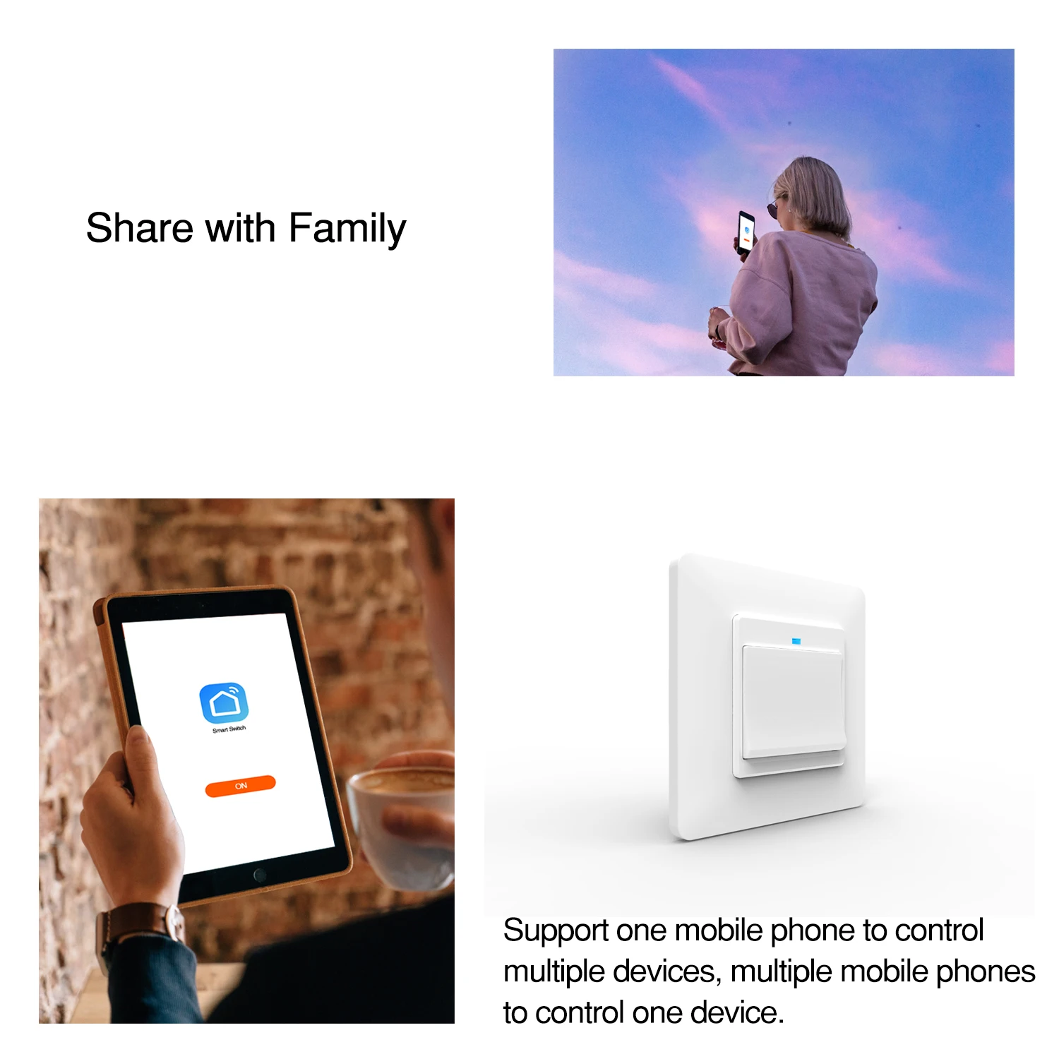 2.Управление из любого места:Новый Умный кнопочный переключательС гнездомРаботает сSmart Life/Tuya smart appЧтоПомогает подключить ваш умныйПереключательИ розетка в одной стенеДля того, чтобы ваш дом 2,4 ГГц Wi-Fi. Вы можетеУдаленноУправляйте любымИз этих выключателейИли розеткиИз любого места, где вы хотитеОдно приложение.