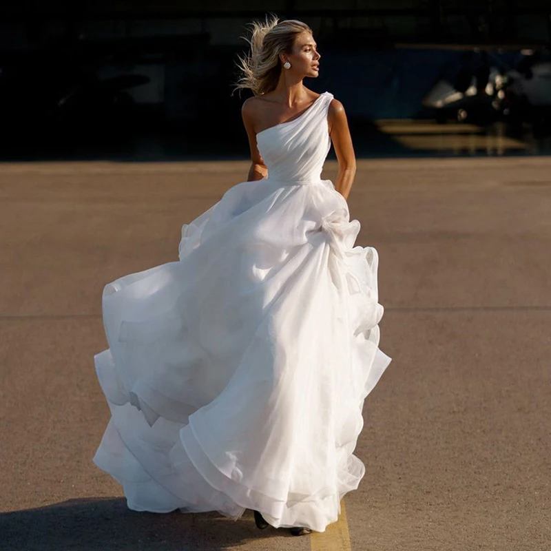 Белое Элегантное свадебное платье на одно плечо, пышное, ТРАПЕЦИЕВИДНОЕ, с оборками, из органзы, Тюлевое, свадебное платье на заказ, со шлейфом в богемном стиле, 2021