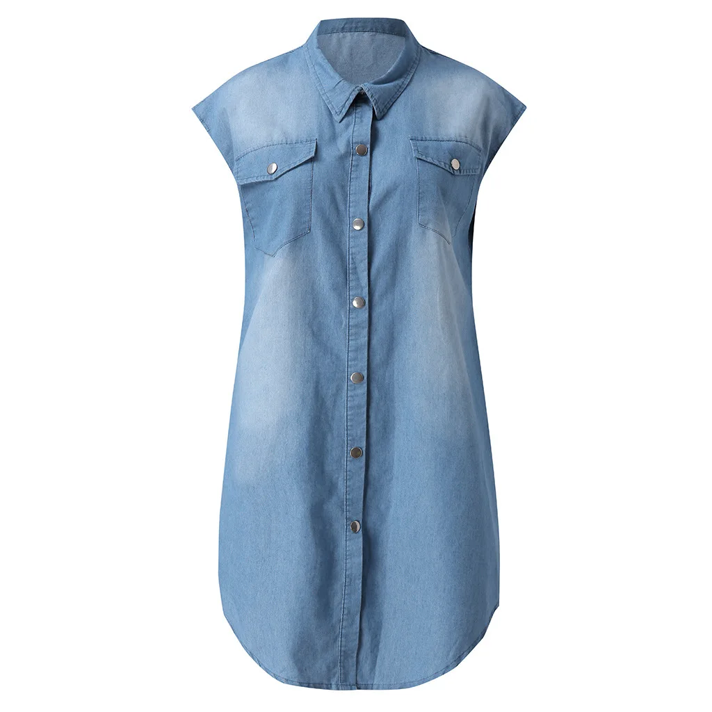 Новое летнее джинсовое платье с короткими рукавами в европейском и американском стиле с открытым нагрудным воротником и карманами на пуговицах