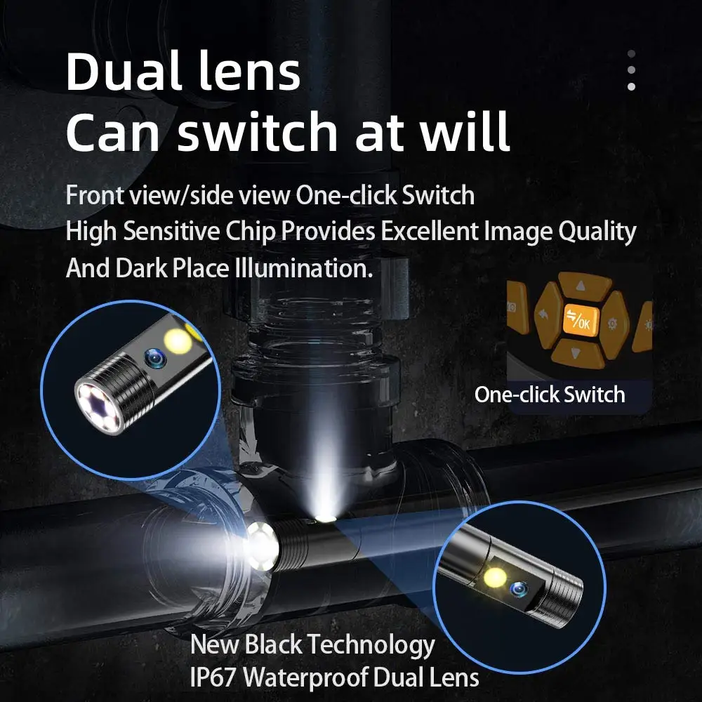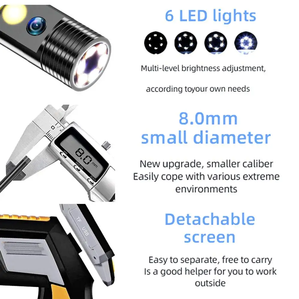 ▶【Многофункциональная двойная Lens】 2 HD inpection камеры встроены в объектив, одна основная передняя линза и одна боковая линза, чтобы дать вам обзор 140 dgrees. И с одним нажатием кнопки, вы можете переключить вид спереди и вид сбоку по желанию. Фокусное расстояние до 4 дюймов.▶【 Водонепроницаемость и кабель 】 этот промышленный эндоскоп-бороскоп имеет водонепроницаемую трубу и объектив IP67, подходит для работы под водой. Твердость кабеля может проходить через многие Неприкасаемые области, в отличие от некоторых мягких кабелей, этот кабель не просто гибкий, но и прочный.▶【Качество света и изображения 】 с ЖК-экраном с высоким разрешением 1080P, эта Инспекционная камера может предоставить Вам высокое качество изображения и видео. 6 светодиодов высокой яркости позволяют регулировать несколько уровней в соответствии с вашими потребностями. Объектив диаметром 8 мм обновлен, меньший калибр, легко справляется с различными экстремальными условиями окружающей среды.▶【Перезаряжаемый полимерный литиевый аккумулятор 】 2600m Ah высокая емкость Встроенный высокопроизводительный полимерный литиевый аккумулятор обеспечивает низкое энергопотребление и более прочный▶【Съемный экран и полезные аксессуары kits】 съемный экран позволяет легко отделить, свободно носить с собой, когда вы работаете снаружи. Аксессуары включают комплект водонепроницаемых колпачков, боковые зеркала, магнитную крышку и крючки. Правильное использование аксессуаров может обеспечить эффект amzing.