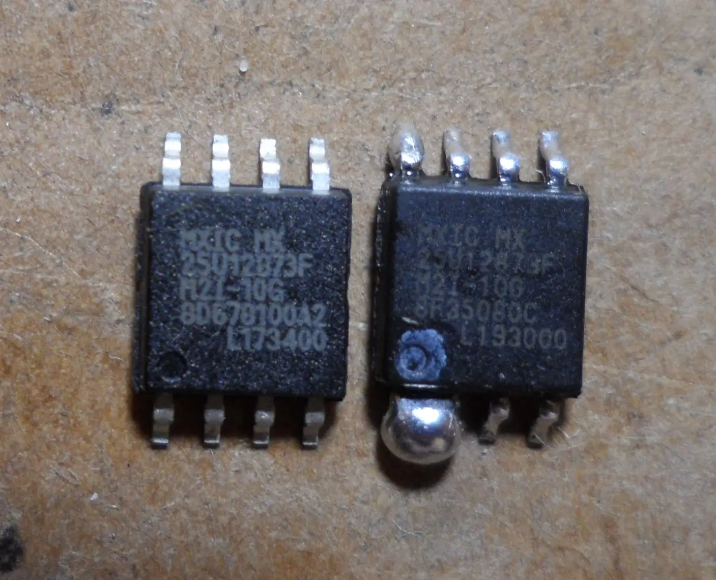 Чипы как в описании. Шрифт похож на оригинал, пластик - нет. Тем не менее, флэш рабочая. Прошил через CH341APro (с резисторами 4.7 ком с 3 и 7 ноги) с самодельным переходником на 1.8 вольт (комплектный оказался бракованный) через программу Colibri, Оживил b450 aorus elite v1.0