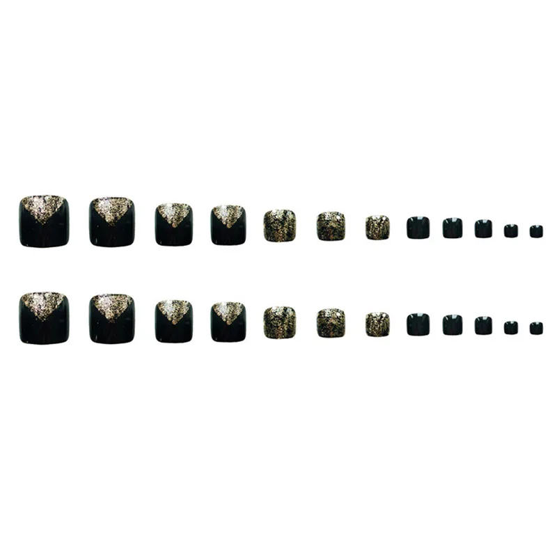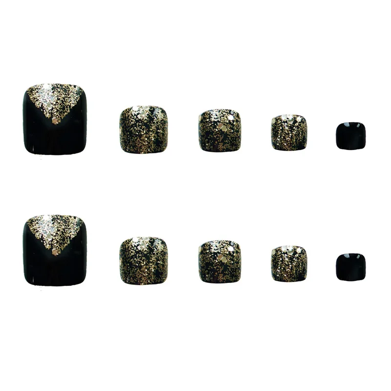 24 шт.кор. Блестящий золотистый и черный поддельные Ноготь на ноге с помощью клея Сексуальная Девушка Лето носимых полное покрытие короткие накладные ногти