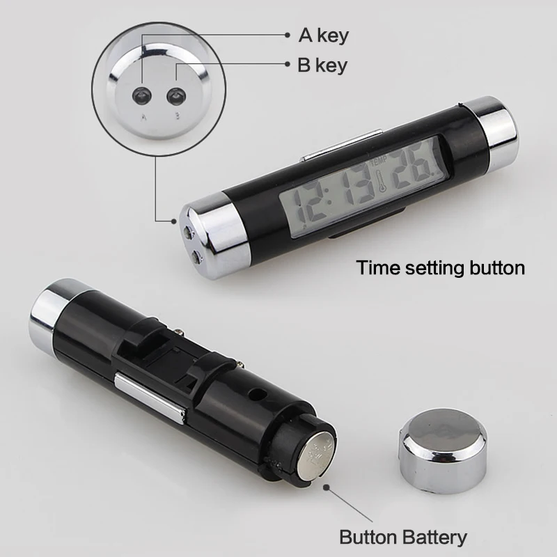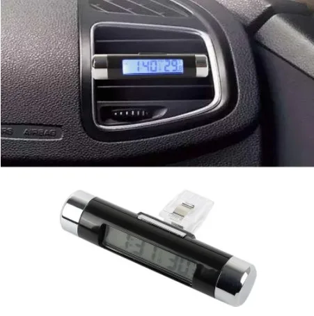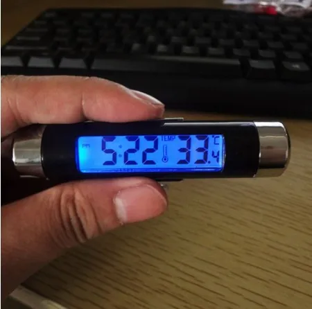 Характеристики: термометр для часов транспортного средства. Часы, функция отображения температуры, задний светильник: если задний светильник имеет кнопку, он будет светильник около 5 секунд после нажатия, оснащен зажимом, который может зажимать выход кондиционера/солнцезащитный козырек для легкой установки.