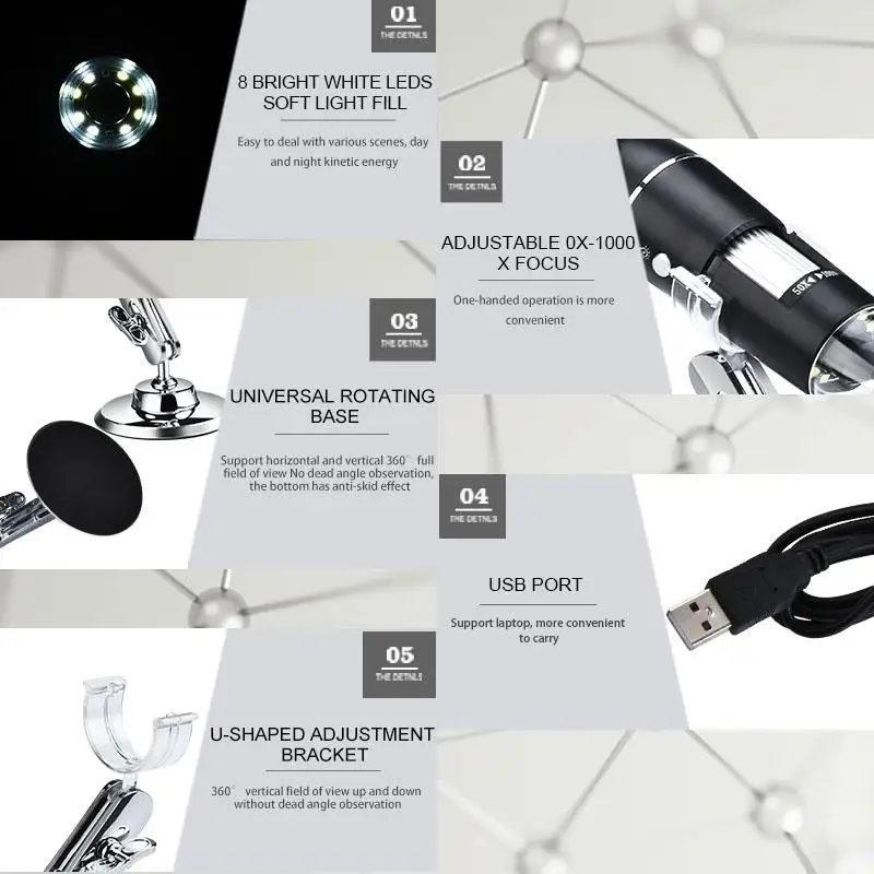 Компьютерное программное обеспечение для микроскопа Ссылка для скачивания:Http://www.hvscam.com/soft.asp?lang=enСпецификация:Цвет: черныйИнтерфейс: USBУвеличение: 500X, 1000X, 1600XМатериал: АБС-пластик, электронные компонентыРазмеры: 14,5*10*5 смПримечание:-Возможны небольшие погрешности в размере при ручном измерении.-Из-за различных эффектов освещения и настроек монитора фактический цвет товара может не точно отражать цвет на фотографиях.Упаковочный лист