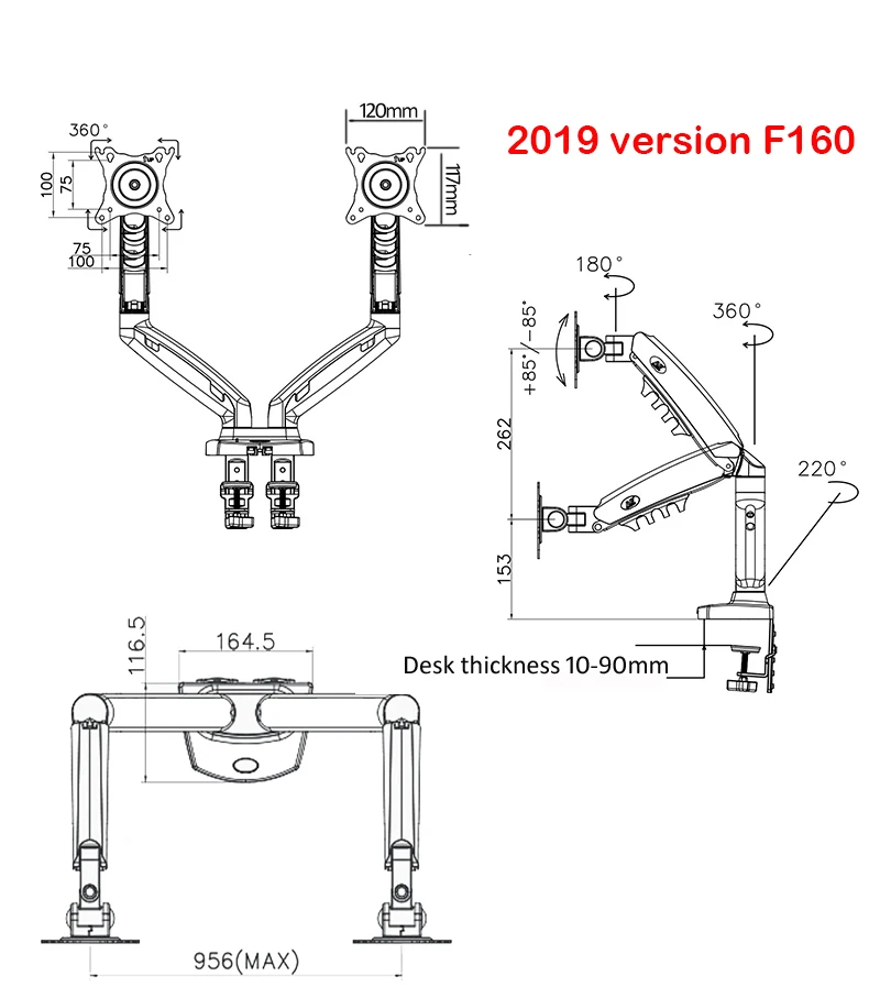 F160N-Desktop двойные экраны flexi-mount▪ Подходит для большинства дисплеев 17 "до 30" X2■ Поддержка нагрузки от 4,4 до 19,8 фунтов (2-9 кг) X2.▪ VESA совместимый 75x75, 100x100 mmX2■ Вертикальное расстояние подъема: 10 ” (260 мм)Вращение на 360 °■ Поворотный ± 180 °■ Угол наклона + 35 ° до-50 °■ Продукт производится только в черном цвете для этой модели
