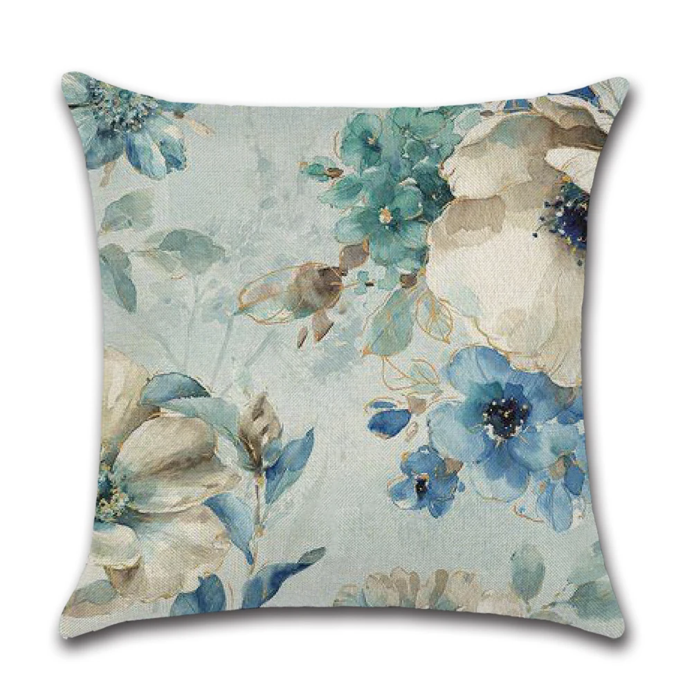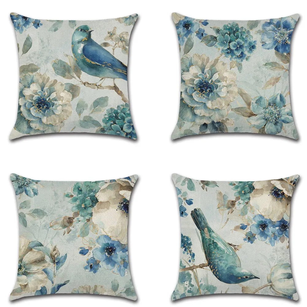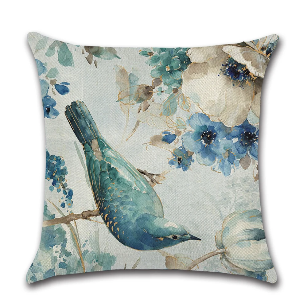Синяя искусственная Обложка гуашь, цветы, птицы, поясная подушка, Чехол 45*45 см, льняная Подушка с животным рисунком для автомобиля, дивана, подушки, чехол, домашний декор