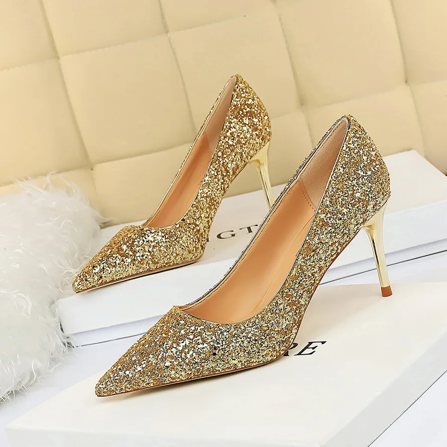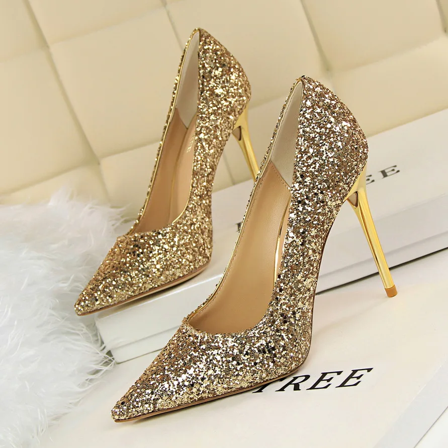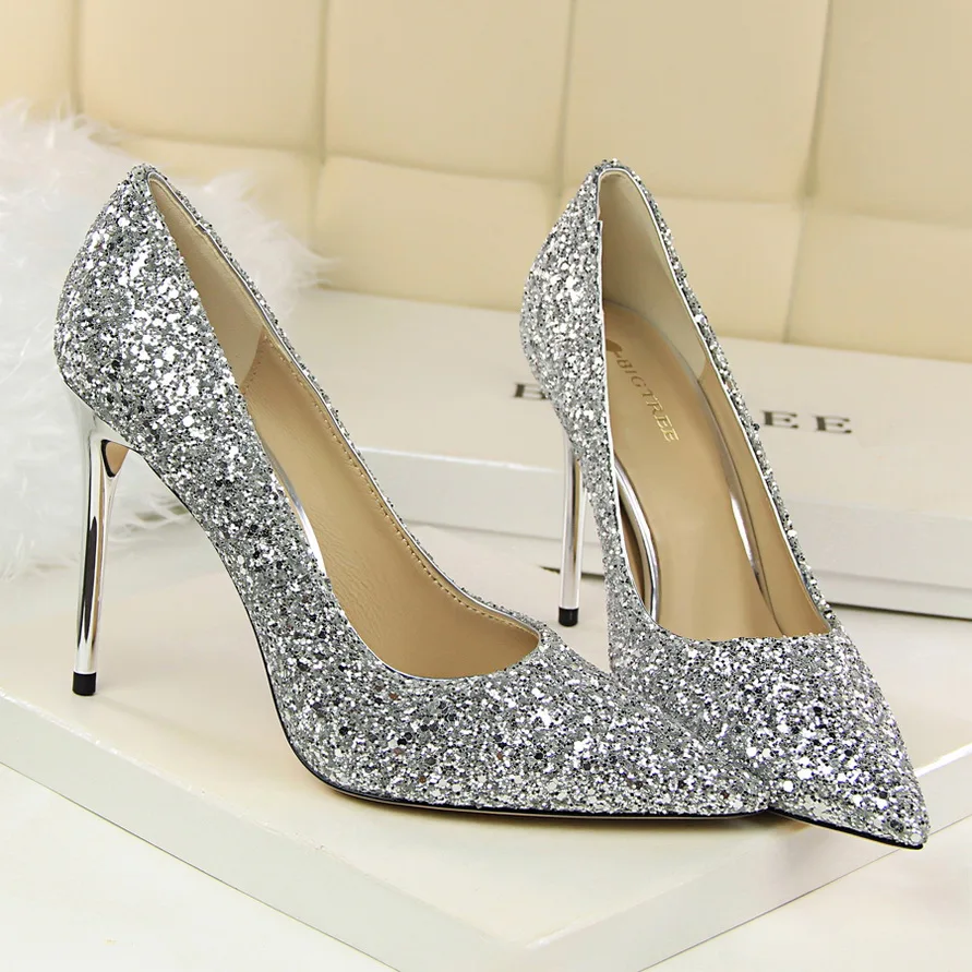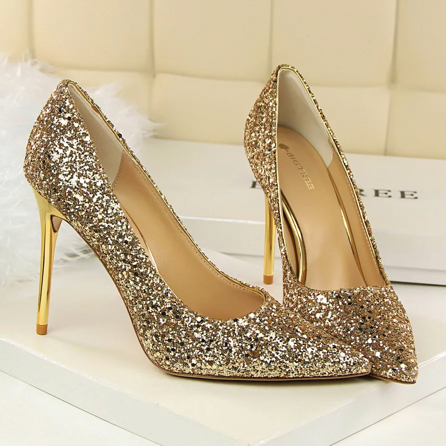 Женские туфли на шпильке 2021 см, туфли-лодочки с острым носком, блестящие Роскошные привлекательные вечерние туфли золотого и серебряного цвета для свадьбы, 9,5