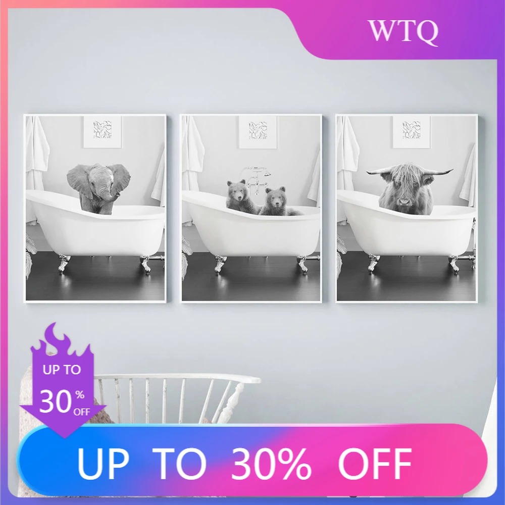 Настенная живопись, холст, слон, корова, медведь, детское животное в ванне, Модульная картина, скандинавский постер для украшения детской комнаты