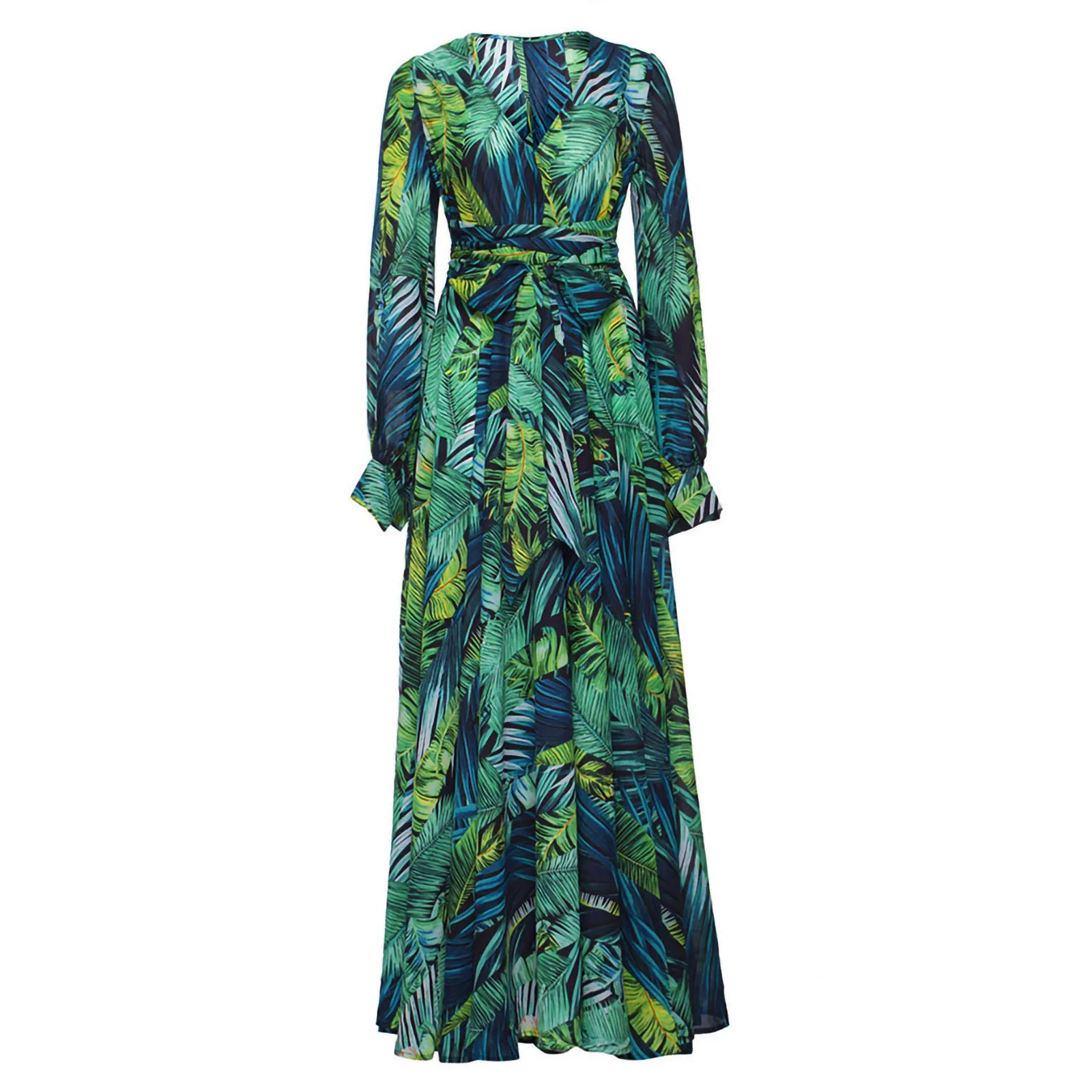 Женское длинное платье в стиле бохо, повседневное Пляжное Платье макси с открытой спиной и принтом зеленых листьев, с V-образным вырезом, лето летнее платье