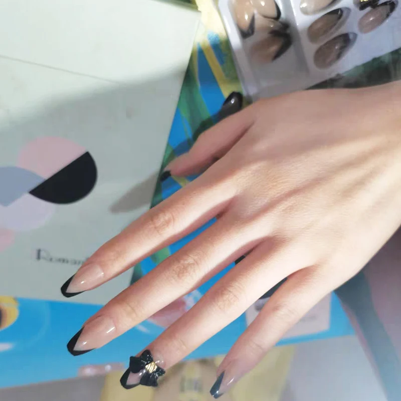 Черный бант, черная кайма, декорированные накладные ногти французский маникюр 24 шт с 2 клеем