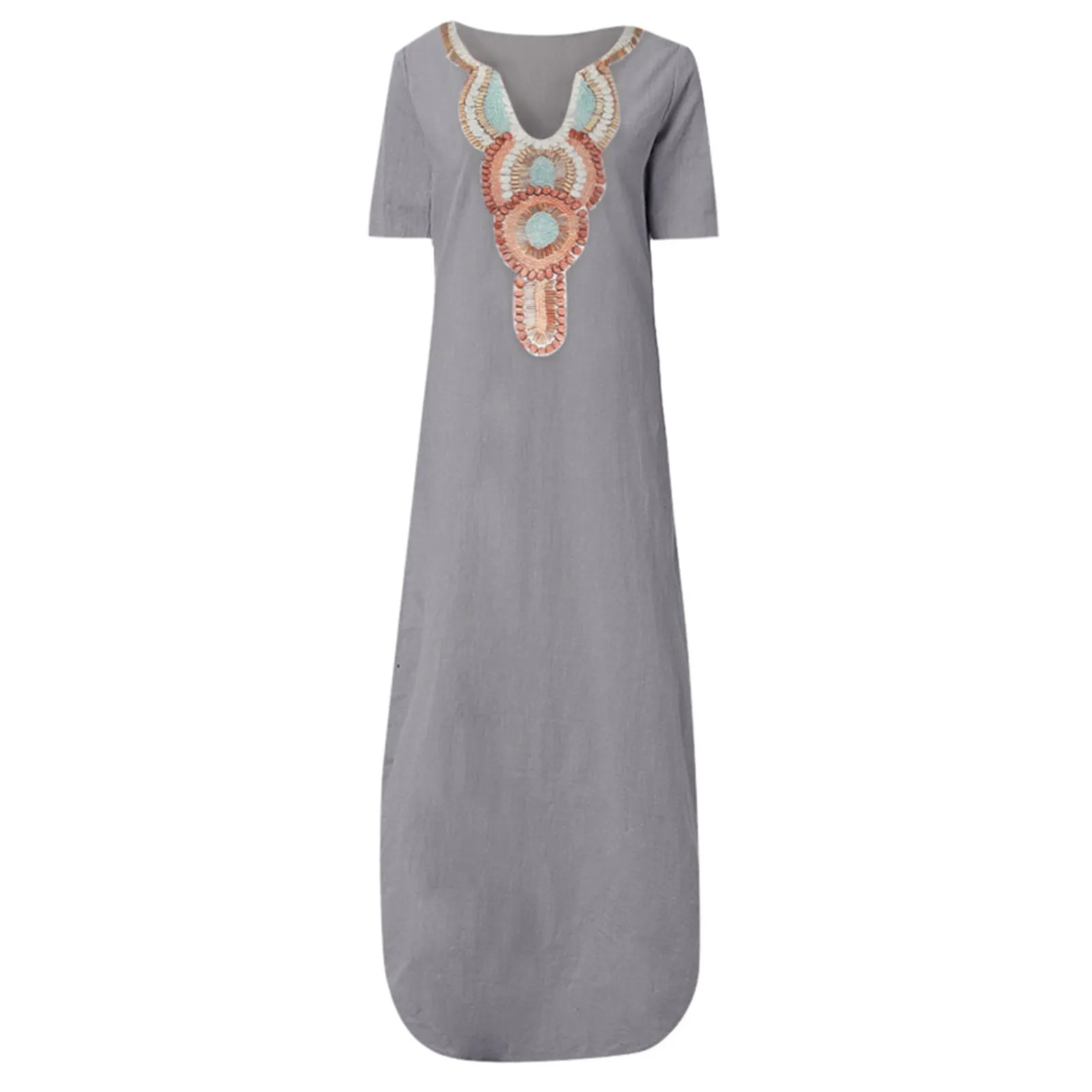 Платье женское хлопково-льняное с высоким разрезом, Длинный Элегантный пляжный сарафан с цветочным принтом, с V-образным вырезом и коротким рукавом, в богемном стиле