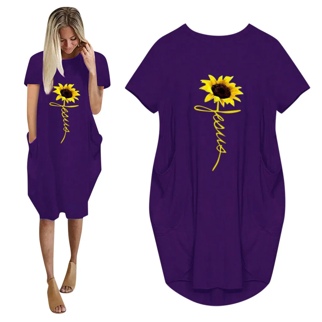 Элегантное летнее платье-футболка с короткими рукавами и принтом св...