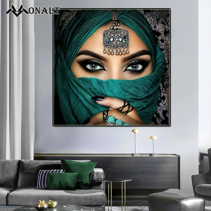 Зеленая вуаль с большими глазами, арабская женщина, Исламская стена, искусство, девушка, печать на холсте, красивая картина, роскошный постер, украшение для спальни