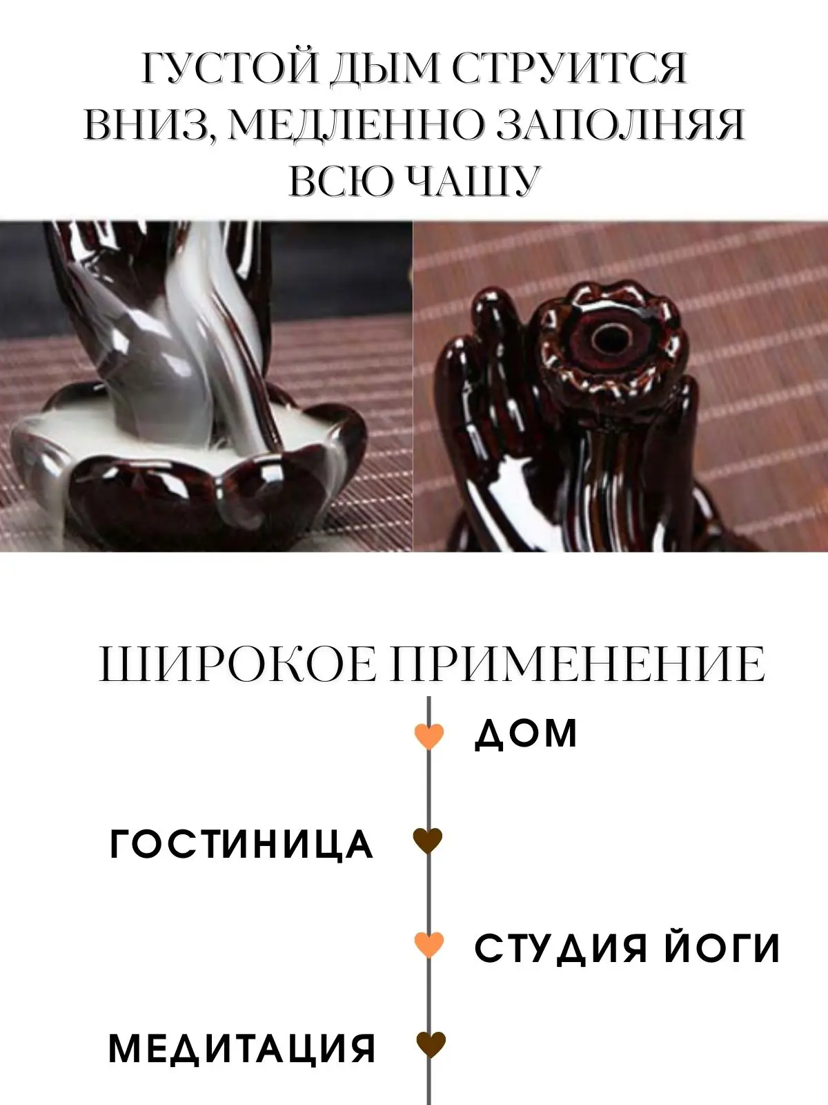 При горении, ароматные конусообразные благовония создают эффект стелющегося дыма. Дым от этих благовоний не поднимается вверх, а медленно и красиво стекает вниз, заполняя всю чашу.
