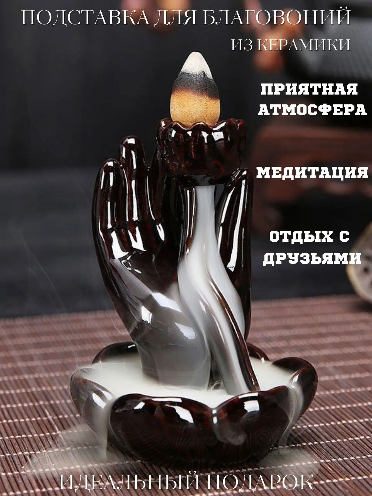 Изготовлена из высококачественной керамики. В подставке есть отверстия для конусных благовоний с обратным потоком. Особый дизайн подставки создает эффект стелющегося ароматического дыма. Время тления одной пирамидки 15-20 минут. Размер 9.5 х 7.2 смПодставка для благовоний поможет Вам расслабиться и успокоить нервы. Ее можно использовать дома, в офисе, в гостинице, в студии йоги, в буддийском храме. Она идеально подойдет для медитаций и духовных практик.Рекомендуется использовать подставку для благовоний в защищенном от сквозняков месте.