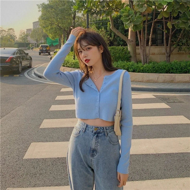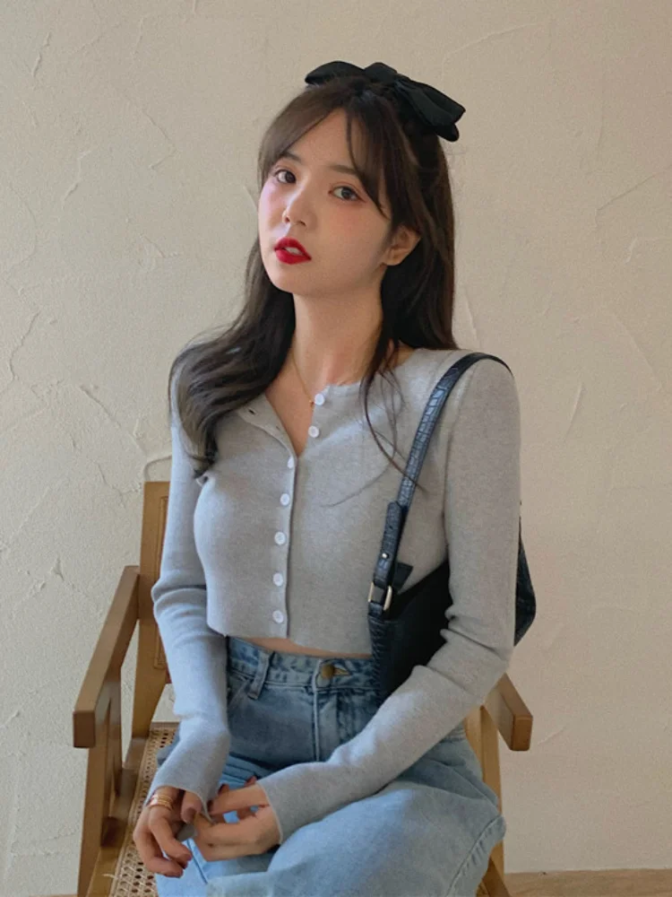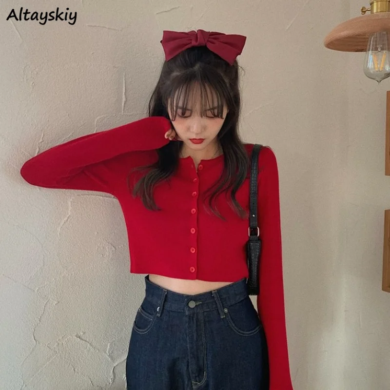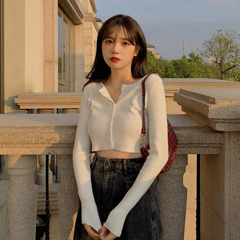 Футболки женские с длинным рукавом, простой вязаный Универсальный однотонный однобортный милый укороченный топ с круглым вырезом в Корейском стиле для девушек
