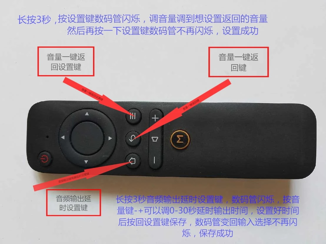 4. Пульт дистанционного управления для регулировки громкости также имеет функцию возврата одной кнопки громкости, пользователь может задать громкость, которая будет возвращена по желанию, независимо от того, где установлен текущий громкость, просто нажмите кнопку громкости на пульте дистанционного управления, чтобы вернуться к нужной громкости. (Нажмите клавишу set на пульте дистанционного управления, индикатор громкости мигает, Затем нажмите клавишу громкости, чтобы установить громкость в нужную настройку, а затем нажмите кнопку настройки назад, чтобы сохранить)