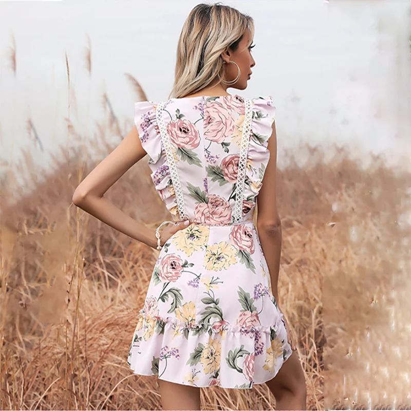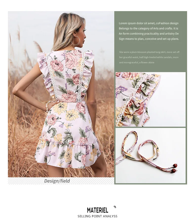 платье летнее женское мини платье без рукавов с цветочный принт, элегантное Бандажное платье с рюшами, Повседневные Вечерние платья, модная женская одежда 2021