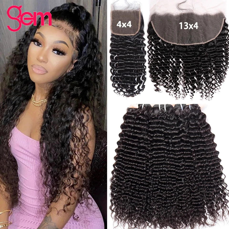Глубокие кудрявые пряди с фронтальным драгоценным камнем волосы Remy бразильские 3 4 пряди человеческие волосы для наращивания 30 дюймов 5X5 закрытие пряди
