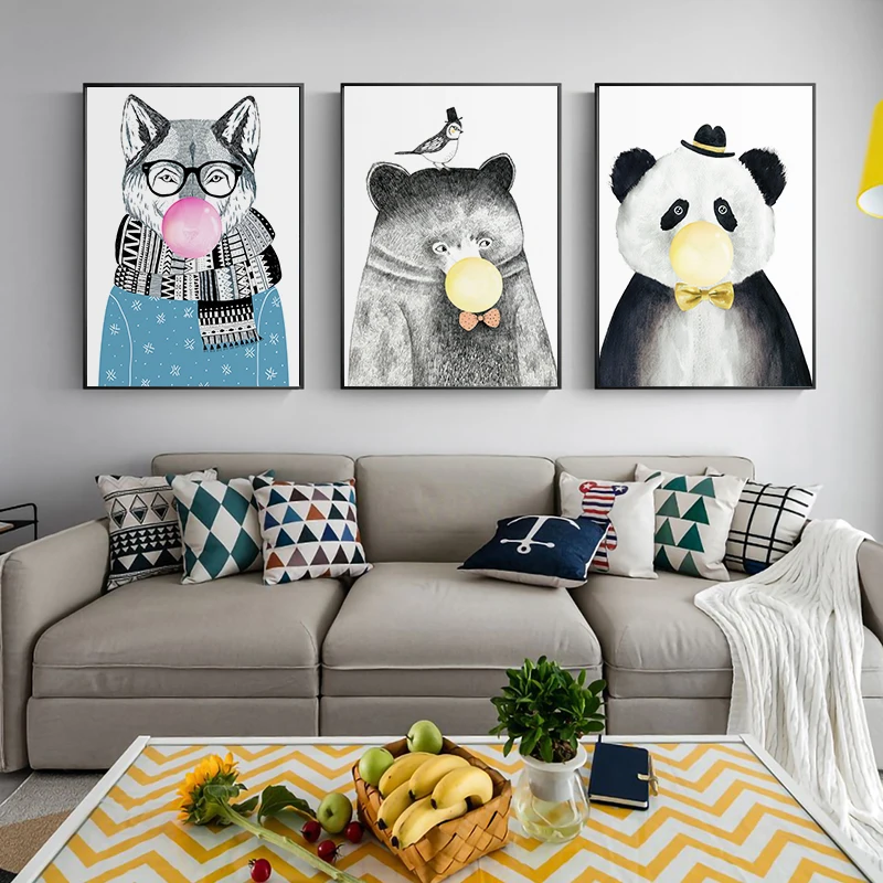 Постер с изображением панды, волка, розового и желтого цветов, принт для детской