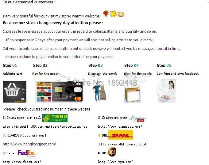 Доставка занимает 5 рабочих дней, также доступны FEDEX,TNT,EMS.