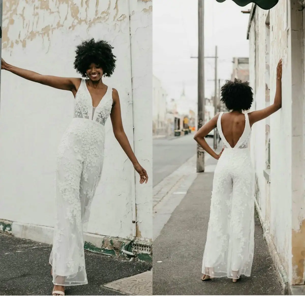 Элегантный комбинезон Свадебные платья Белый v-образный вырез кружева аппликация Брюки Свадебные платья Boho Сексуальная Открытая спина стиль страны Vestido De Novia