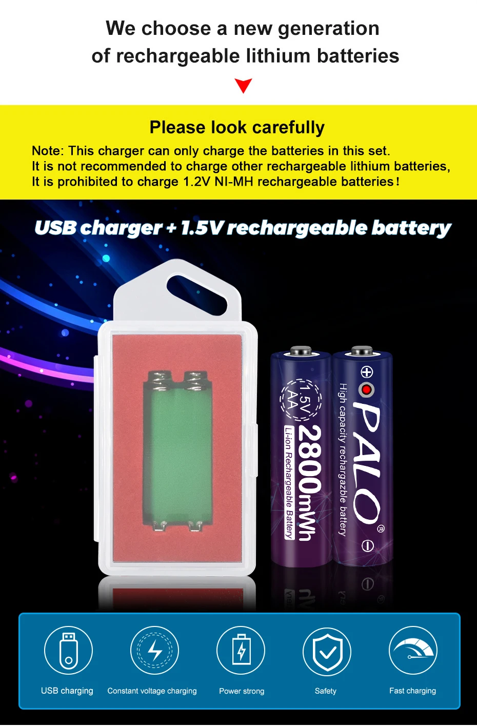 1. Батарея Тип: 1,5 V AA перезаряжаемый литий-ионный аккумулятор Батарея2. Размер батареи: 50 мм * 14 мм3. Емкость аккумулятора: 2800mWh4. Батарея напряжение: 1,5 V5. Время зарядки: около 1500 раз6. Рабочая температура: -20 °C-60 °C7. Светодиодный дисплей: Красный светильник мигает при зарядке, красный светильник мигает после полной зарядки8. С батарейным блоком: влагостойкий, защита от короткого замыкания9. Характеристики: Высокое напряжение и большая емкость, больше времени работы10. Совет: в связи с использованием материалов и принципы работы различных марок 1,5 V батарея отличаются друг от друга, пожалуйста, используйте PALO 1,5 V батарея USB зарядное устройство для зарядки PALO 2800mWh 1,5 V AA литиевая батарея, спасибо.