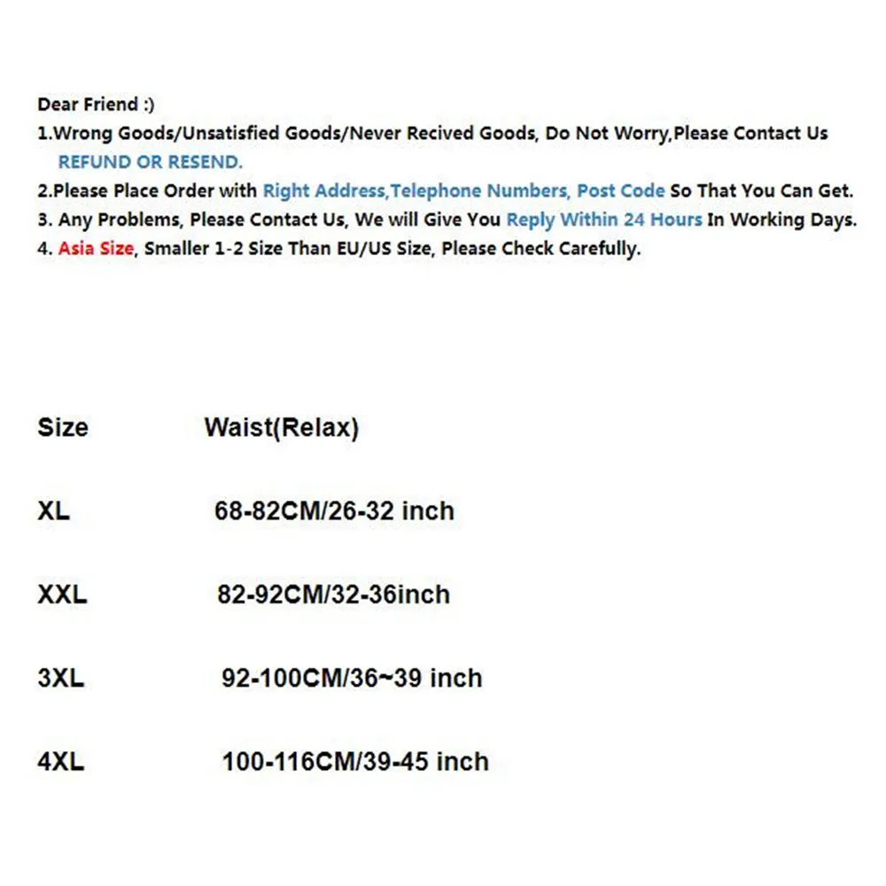 Таблица размеров Размеры Талия (см) Талия (дюйм) М 58-72 23-28 XL 72-82 28-32 XXL 82-92 32-36 3XL 92-100 36-39 4XL 100-116 39-45 Примечания: 1. Азиатский Размер, меньше, чем Европейский/американский размер 2. Выше растягиваются данные 3. Пожалуйста, допускайте ошибку в 1-3 см 4. Из-за разницы в цвете на компьютере