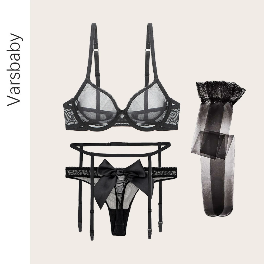 Женский модный комплект Varsbaby из 4 предметов, сексуальное нижнее белье, прозрачный бюстгальтер + кружевные стринги + Пояс для чулок + черные чулки