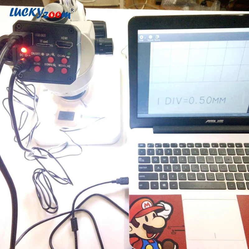 Тестовые детали: тринокулярный микроскоп (не входит в комплект), адаптер для объектива с-образным креплением 0,5x (30 мм), камера для микроскопа HDMI 14 МП, светодиодсветильник 56 шт. (в комплект не входит), один ноутбук