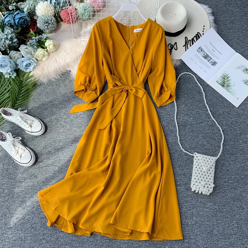 Женское длинное платье-миди, с V-образным вырезом, с высокой талией