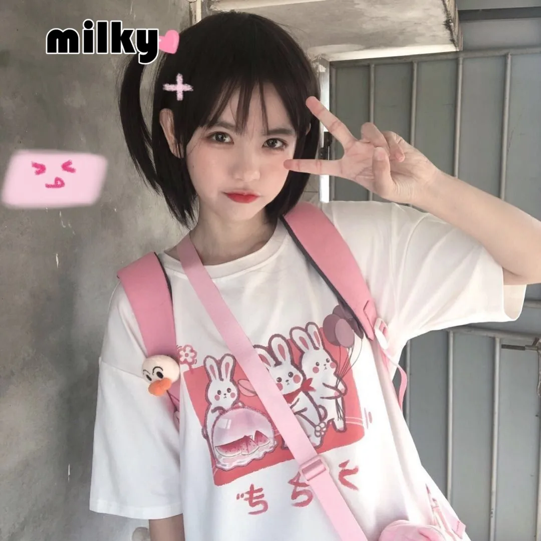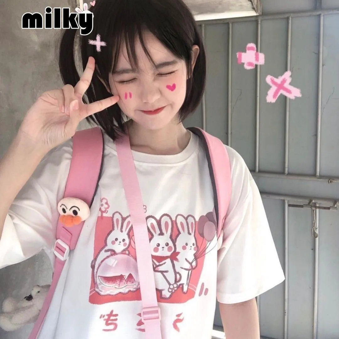 Футболка Uzzlang с милым кроликом из мультфильма для милых девушек Harajuku летняя футболка большого размера забавные kawaii повседневные топы винтажные женские футболки