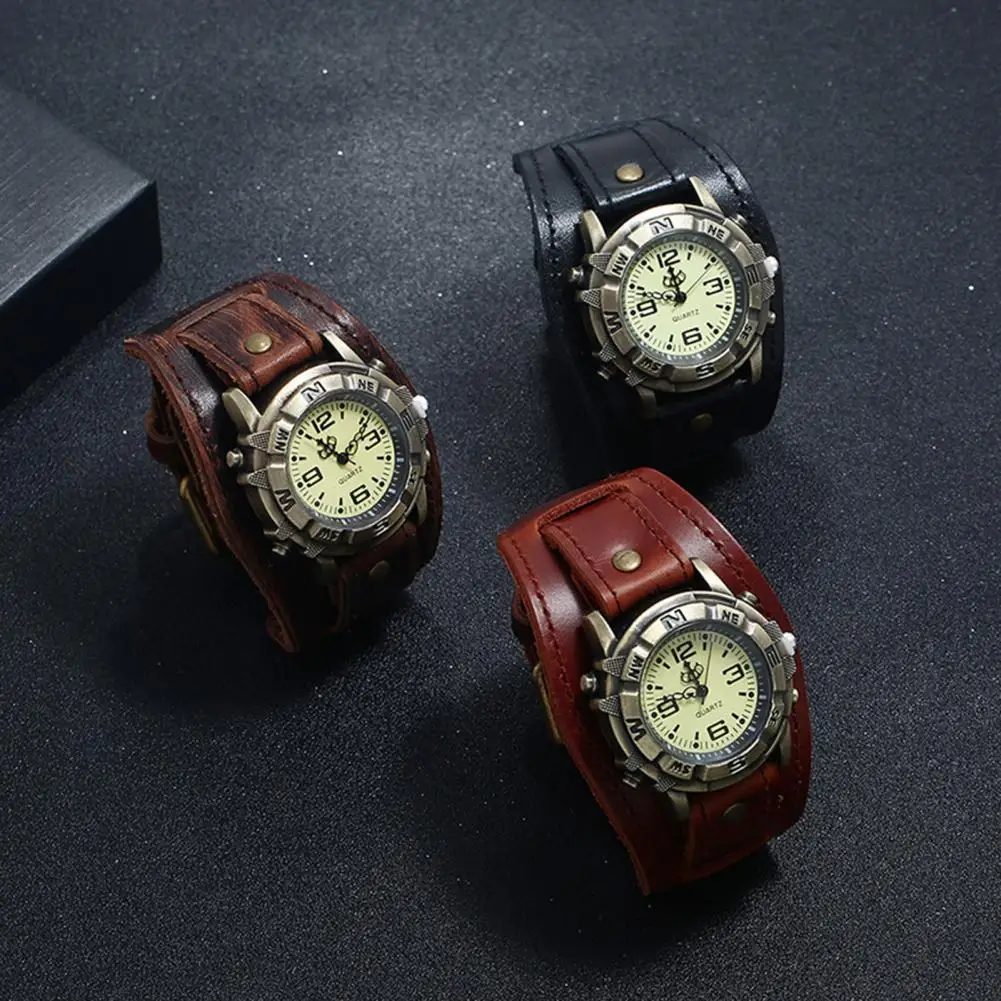 Часы мужские кварцевые в винтажном стиле с широким ремешком из натуральной кожи