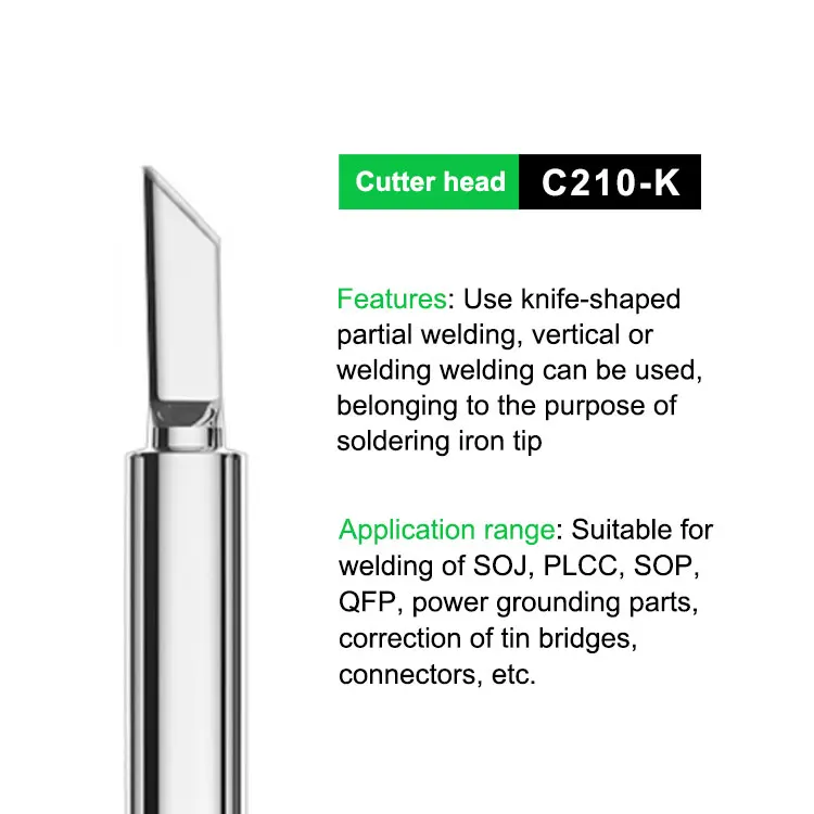Изогнутый/острыйРежущая головкаОсобенности: наконечник паяльное жало небольшого размераДиапазон применения: подходит для тонкой сварки или небольшого сварочного пространства, а также может исправить жестяной мост, генерируемый при сварочных чипахХарактеристики: используется частичная сварка в форме ножа, вертикальная или сварочная сварка может быть использована d, принадлежащая цели наконечника паяльникаДиапазон применения: подходит для сварки SOJ, PLCC, SOP, QFP, деталей для заземления питания, коррекции оловянных мостов, разъемов и т. д.