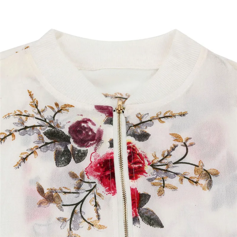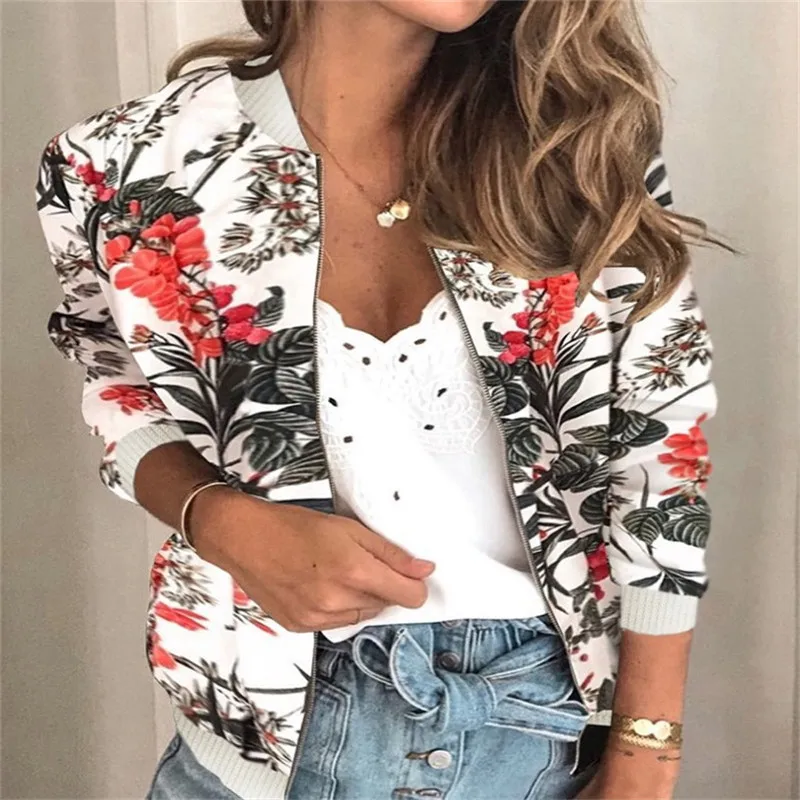Куртка женская короткая тонкая приталенная с длинным рукавом, Байкерский пиджак в стиле ретро с карманами, Дамская с цветочным принтом бомбер на молнии, верхняя одежда на весну