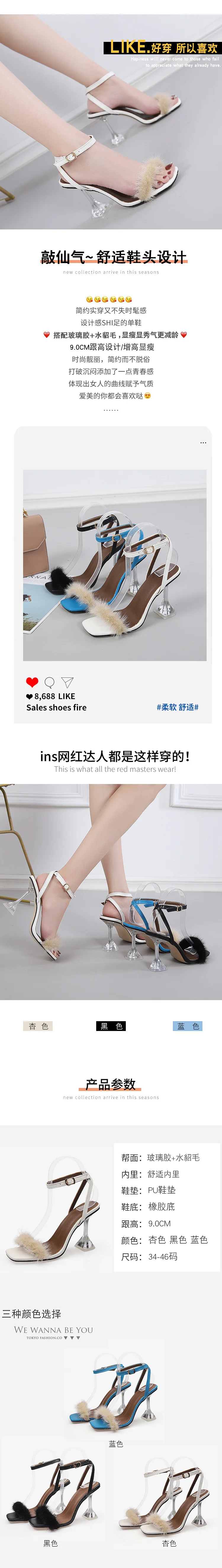 Новая женская обувь; Прозрачная обувь с украшением в виде кристаллов женская обувь на высоком каблуке, с мехом, сандалии женские туфли-лодочки; Женские мюли с открытым носком; Милые женские плюшевые босоножки