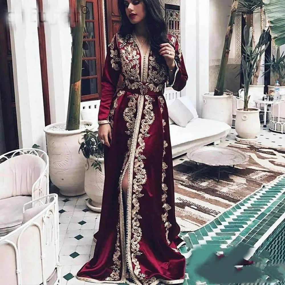 Бордовый марокканский кафтан вечернее платье одежда с длинным рукавом и кружевной аппликацией мусульманское для мусульманских для особых случаев официальная вечеринка