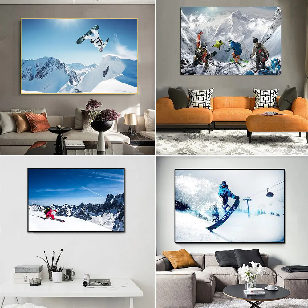 Современная спортивная печать на холсте для катания на лыжах, плакат и сноуборде, Снежная гора, летающая настенная декорация, искусство для комнаты