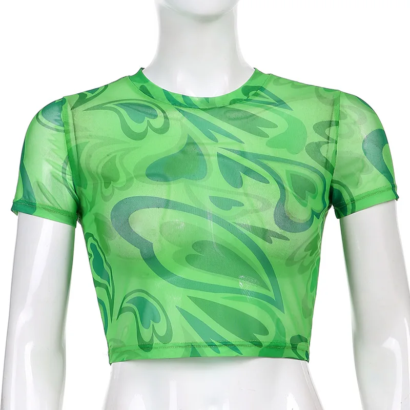 Женские сексуальные футболки из прозрачной сетки, женские облегающие Топы с коротким рукавом и круглым вырезом, с принтом в виде сердца, зеленые, розовые, оранжевые