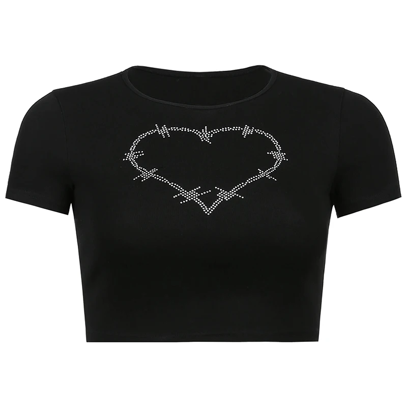 Женская майка в стиле Харадзюку, летняя черная футболка с изображением Стразы сердца и круглым вырезом, короткий рукав, сексуальный укороченный топ Y2k