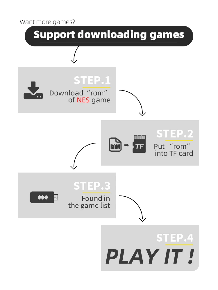 Шаг 1: Загрузите «rom» игры NES. Шаг 2: Поместите «rom» в tf-карту. Шаг 3: найдите в списке игр. Шаг 4: играйте!