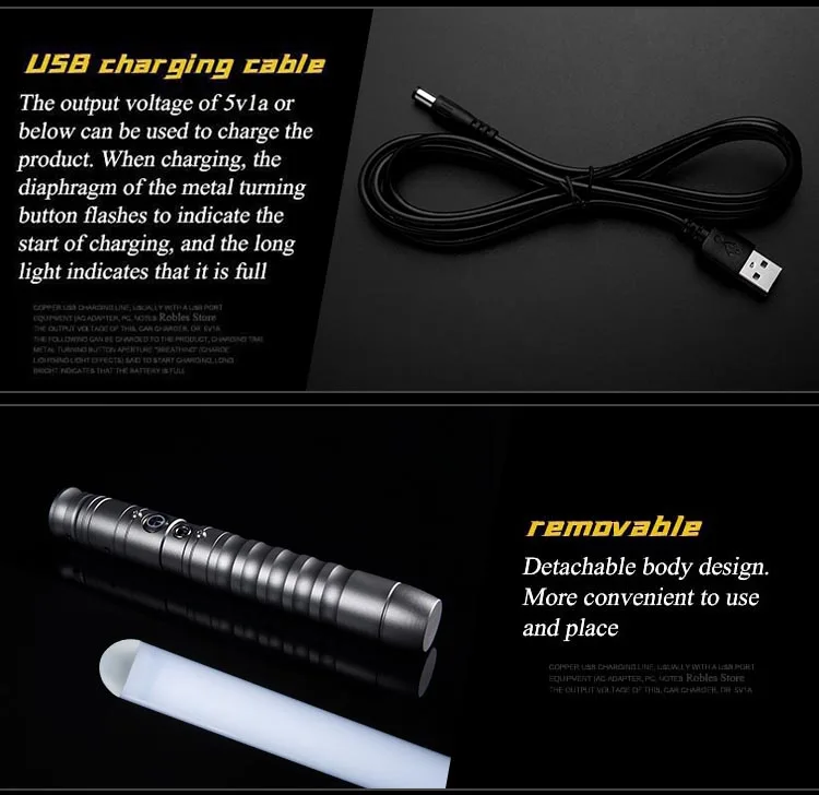 (5 Вт супер яркий, емкость батареи 1200 мАч, 2 набора классических звуковых эффектов, высококачественные металлические кнопки, высокопрочный взрывозащищенный корпус меча, Съемный корпус меча (поддерживается разборка без инструментов, что более удобно), Регулировка размера громкости, функция отключения звука, Регулировка уровня яркости, различные эффекты на светильник, функция памяти, Высокое качество USB кабель для зарядки, инструкции и т. Д.)